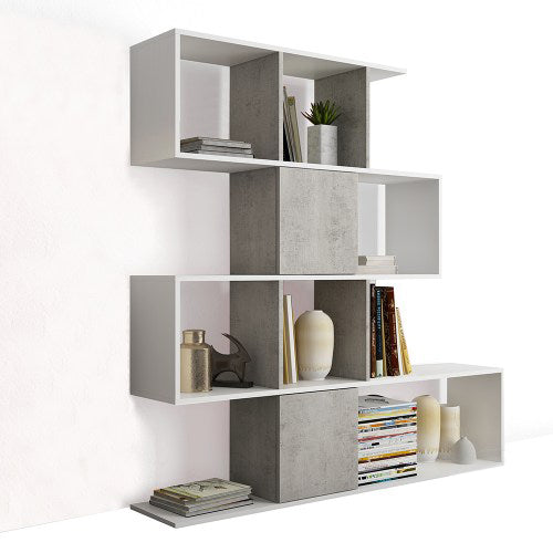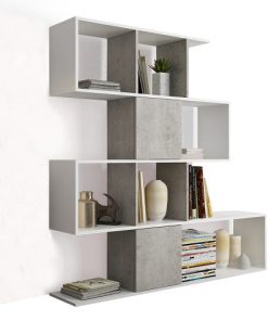 Libreria da parete moderna prodotta in legno in due finiture: larice bianco poro aperto e cemento, un mobile che farà innamorare gli appassionati dello stile contemporaneo. Questo particolare scaffale utilizza il design geometrico e asimmetrico per creare una struttura dinamica e accattivante, fatta esclusivamente di cubi chiusi e aperti.