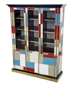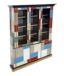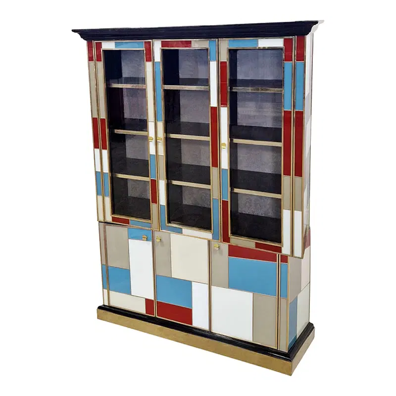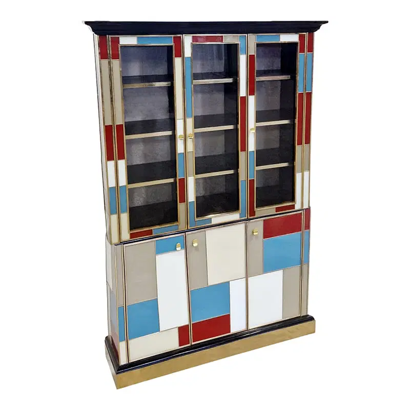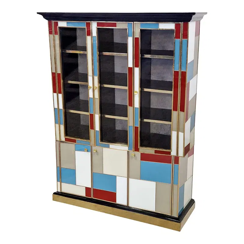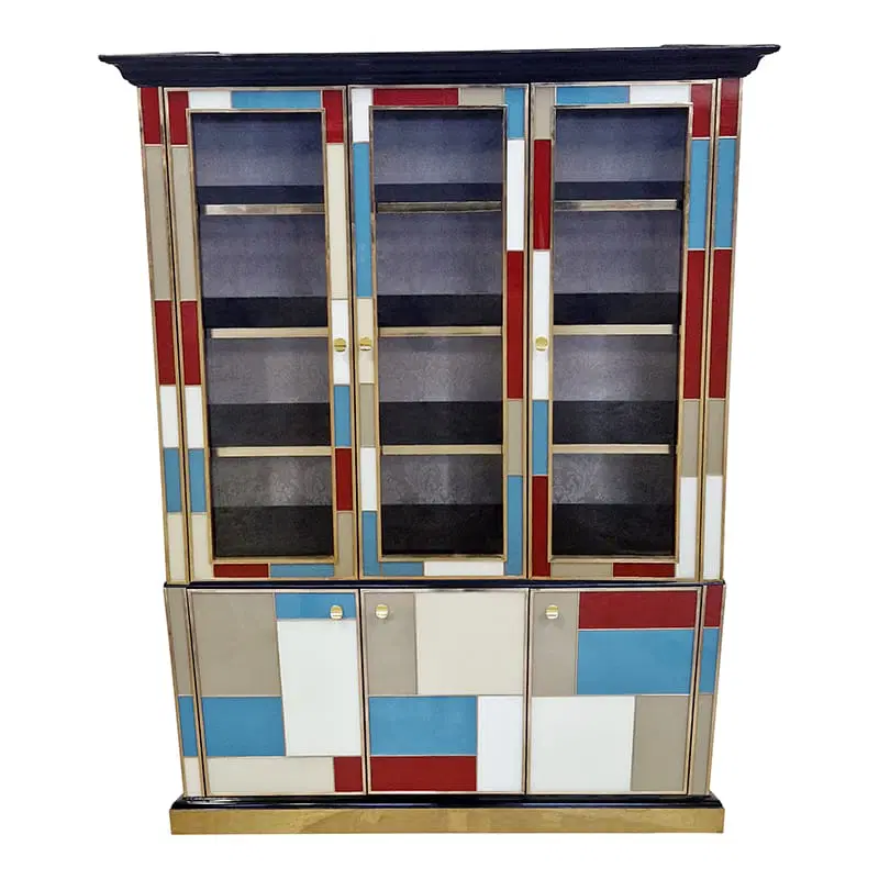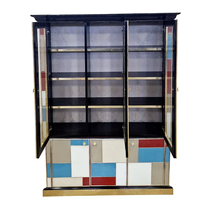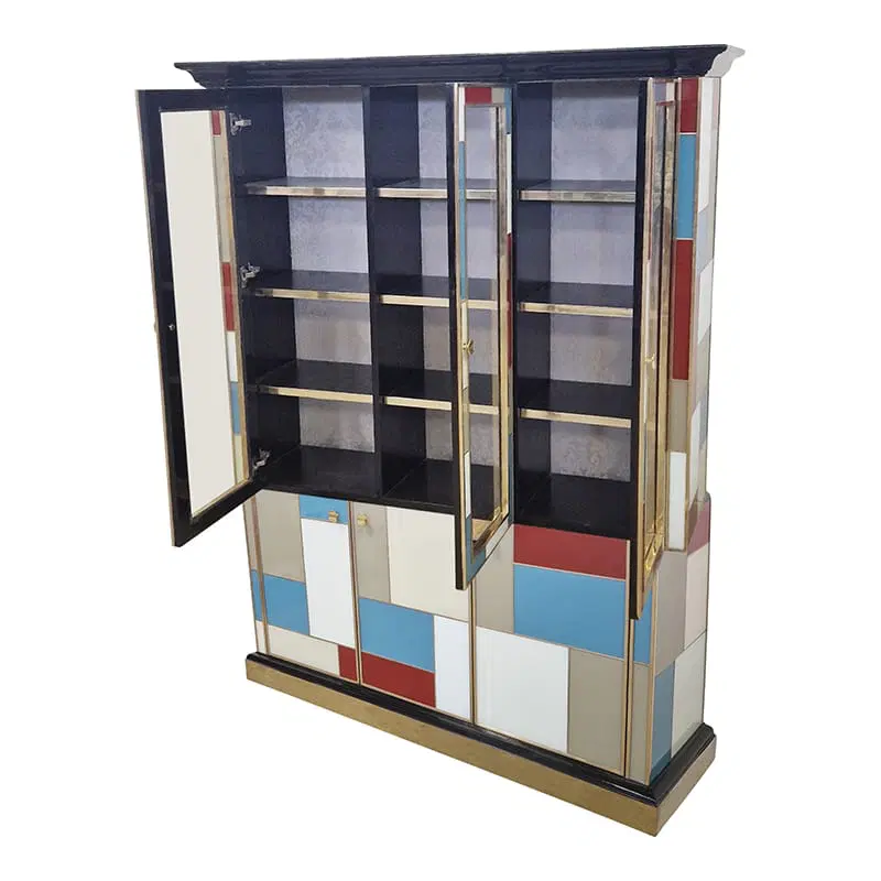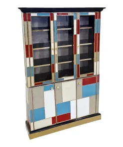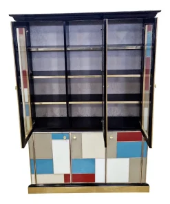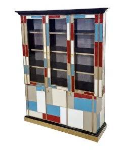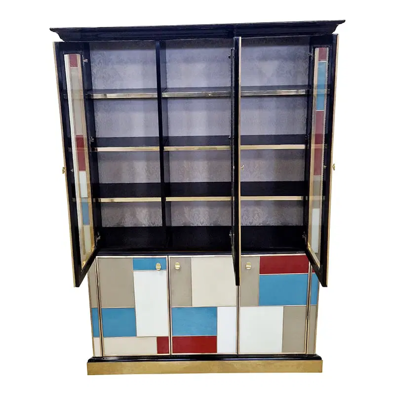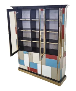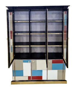 Libreria doppio corpo con due ante vetrate, tre ripiani in legno. Arricchita internamente da specchio illuminato. Interamente realizzata a mano, con struttura in legno rivestita in vetro colorato. Profili in ottone dorato. Base e cornicione in legno laccato nero. Nella parte inferiore tre ante colorate. La struttura si illumina con il telecomando.