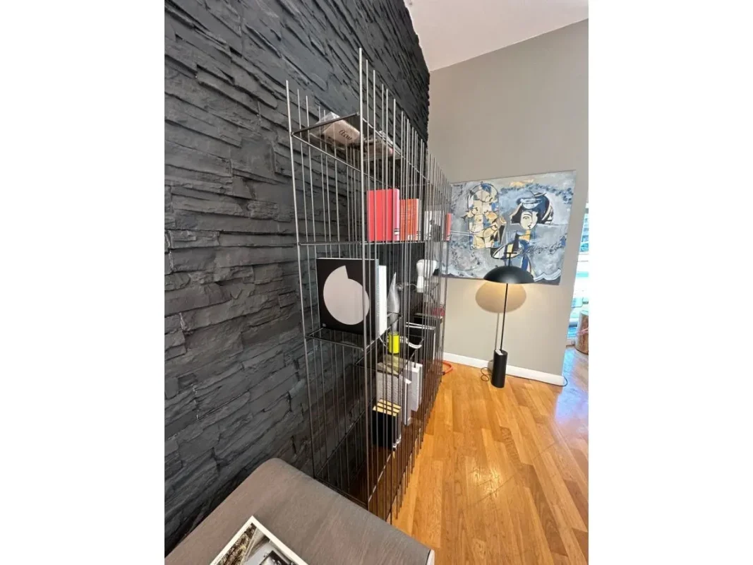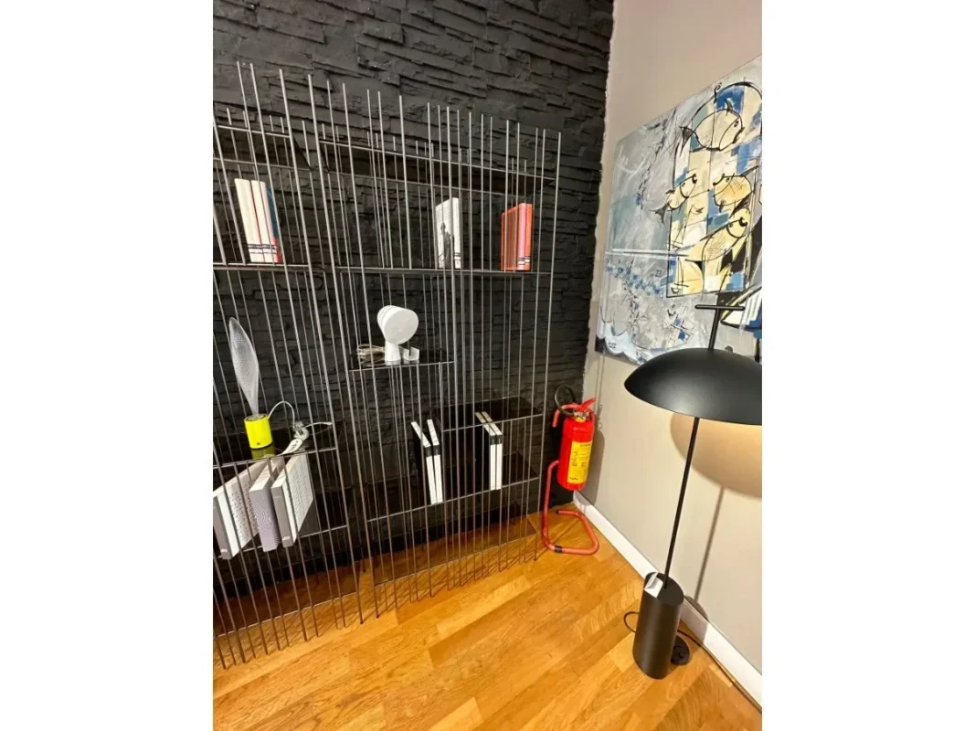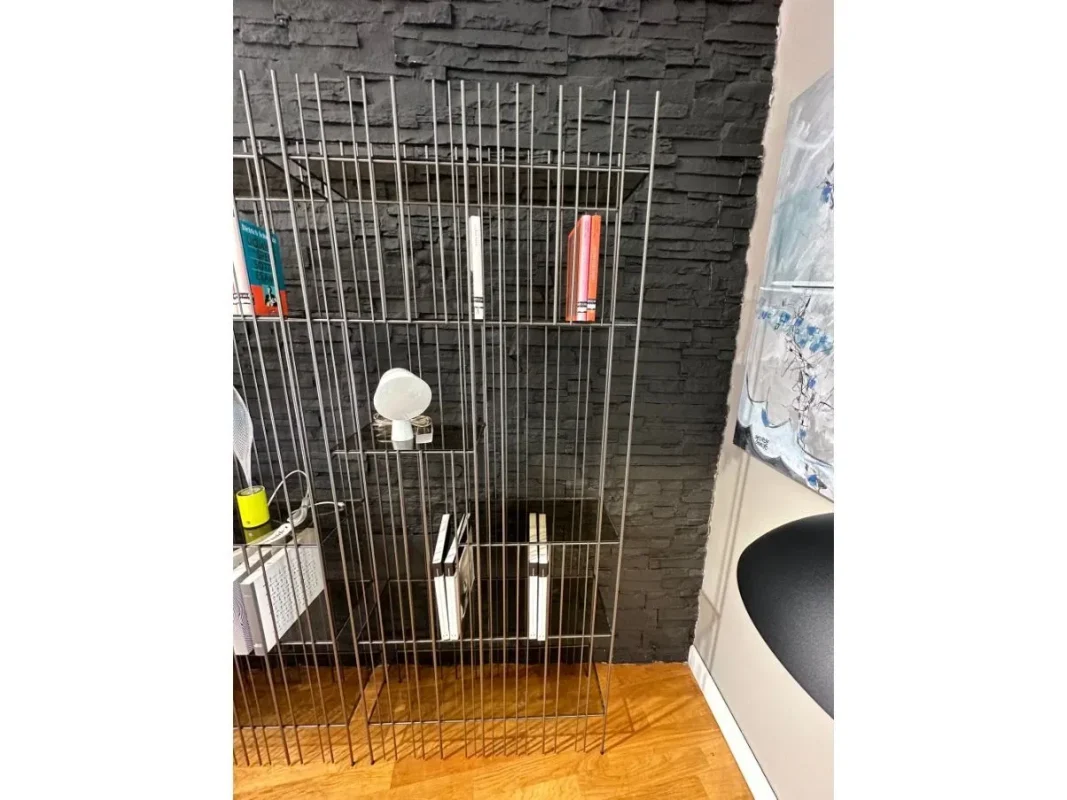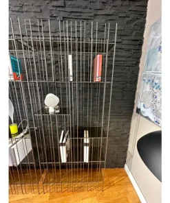 Libreria Metrica con ripiani in cristallo, Mogg. Realizzata con tondini in acciaio cadenzati in differenti diametri con ripartizione irregolare, ripiani in cristallo trasparente. La libreria Mogg è un’ottima scelta per ambienti di qualsiasi tipo, la sua modernità ed eleganza la rendono adatta a qualsiasi arredamento. Può essere posizionata in un soggiorno, in una camera da letto o in una sala d’attesa per mettere in mostra i propri libri preferiti. La sua resistenza la rende un’opzione molto valida per chi desidera arredare con eleganza e versatilità