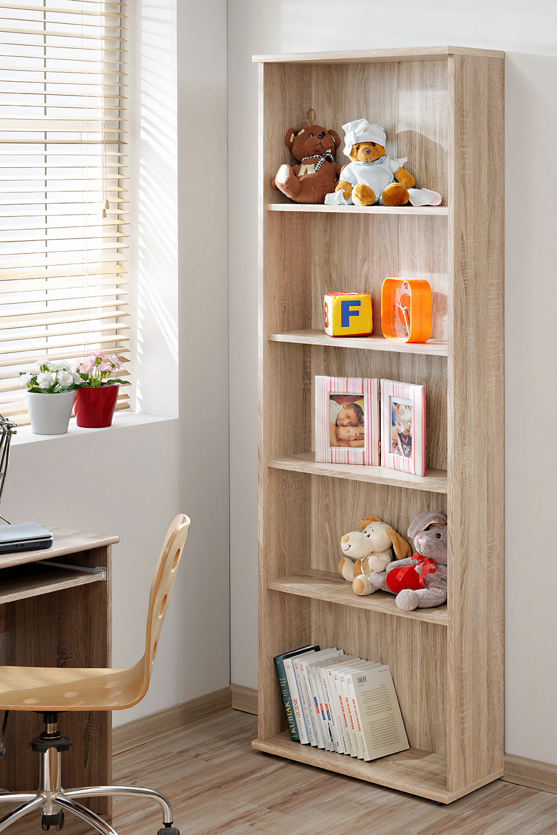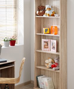 Libreria moderna con 5 ripiani in legno quercia natura, utile sia per lo studio che per la cameretta. Infatti, la libreria fa parte della serie di mobili per camera da ragazzi.