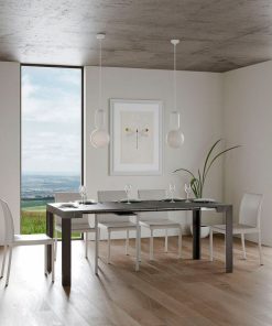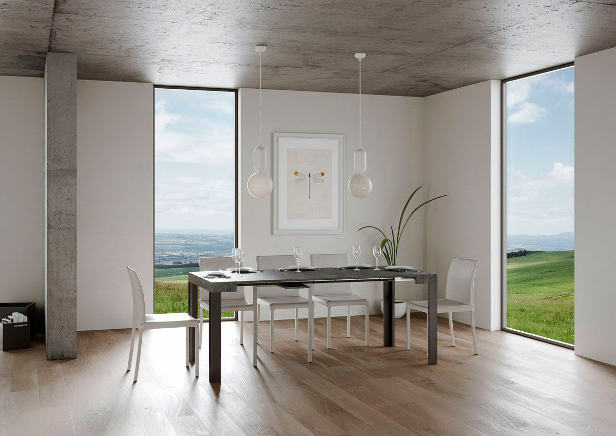 Consolle da ingresso allungabile Linea Small caratterizzata da piccoli dettagli come le gambe angolari in metallo arricchite da inserti in legno, dello stesso materiale del piano realizzato anch’esso in legno finitura cemento. La consolle è anche un valido tavolo a pranzo, in quanto si allunga fino a cm 196, grazie ad un semplice meccanismo di guide telescopiche in alluminio e 3 allunghe, inoltre, un supporto a due appoggiaterra, sarà utile per aumentare la stabilità del tavolo.