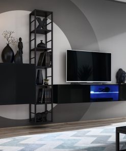 Composizione di due pensili in legno con luci e uno scaffale in metallo colore nero, sufficienti per realizzare una parete attrezzata pratica, bella e moderna. Loira è disponibile in 4 versioni: bianco, nero, antracite con frontali lucidi e una versione quercia natura.