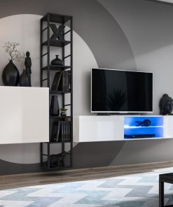 Composizione di due pensili in legno con luci e uno scaffale in metallo colore nero, sufficienti per realizzare una parete attrezzata pratica, bella e moderna. Loira è disponibile in 4 versioni: bianco, nero, antracite con frontali lucidi e una versione quercia natura.