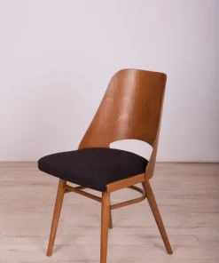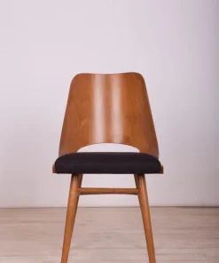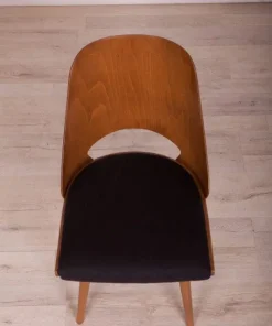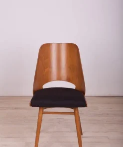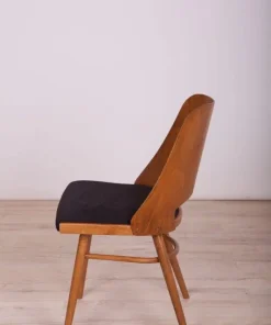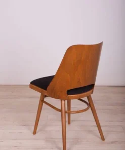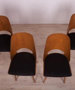 This is a set of 4 Lollipop dining chairs manufactured by Tatra in former Czechoslovakia, The wooden elements have been cleaned, polished, and painted with an oak-colored mordant with a semi-gloss lacquer, The foam has been replaced and covered in black fabric
