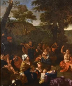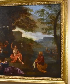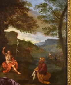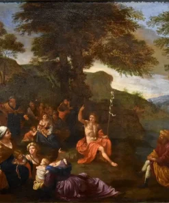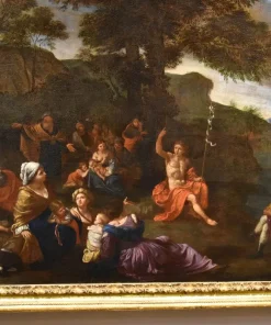 In una radura, all’ombra di alcuni alberi e a ridosso di una zona collinare lungo le rive del Giordano, il giovane precursore di Cristo si trova seduto su una roccia e in posizione oratoria e con un fare maestoso, il braccio destro alzato in direzione della folla che ascolta e si interroga sui sulle sue parole.