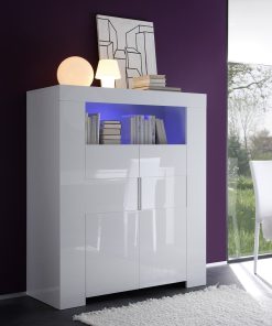 Credenza alta con 2 ante bianco lucido per soggiorno o salotto. Losanna è un prodotto interamente italiano, facente parte di una serie di mobili dal design sobrio e lineare per case moderne.