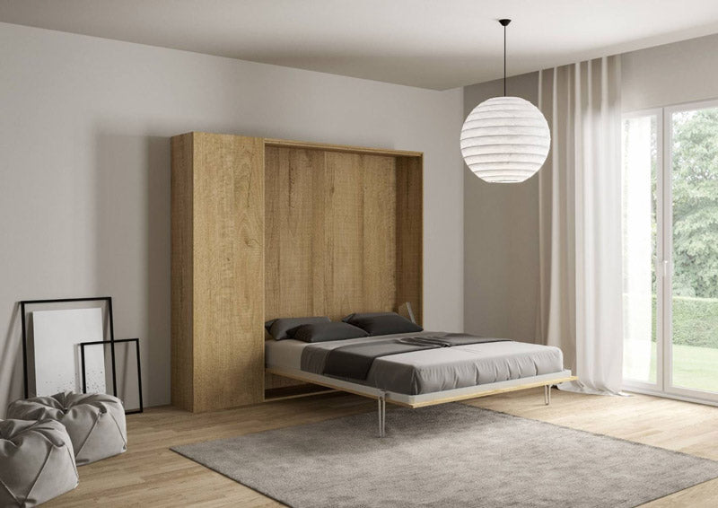 Letto a scomparsa modello Lotis realizzato in legno, un’efficiente idea per avere un letto matrimoniale pronto all’uso e che occupa pochissimo ingombro grazie alla sua struttura compatta e verticale. Infatti l’anta frontale che ospita il letto, si apre in un solo gesto favorito dal movimento assistito da pistoni a gas. Inoltre, la struttura comprende anche una comoda colonna laterale con ripiani interni, diventando un mobile capiente per custodire tutto ciò che necessita.