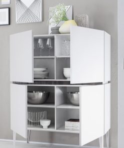 Bellissima credenza 4 ante Lovy prodotta in legno bianco opaco dal design spiccatamente moderno e minimale. Infatti, presenta una struttura lineare divisa dalle 4 ante senza maniglia, contrastata da un inserto centrale colore rovere wengé finitura che viene ripresa dallo zoccolo inferiore. Lovy presenta anche una variante con inserto e zoccolo dello stesso colore della struttura per chi preferisce completamente bianco.