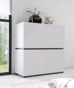 Madia 4 ante Lovy dal design moderno ed essenziale realizzata in legno bianco opaco con inserto e zoccolo colore rovere wengé oppure bianco. Oltre alla credenza moderna Lovy potrai scegliere di aggiungere uno dei mobili living della stessa linea e creare un ambiente distinto e originale.