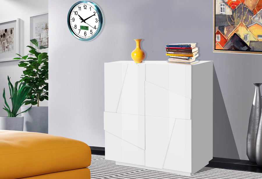 Elegante credenza in legno, con struttura dotata di 2 ante e 1 ripiano interno. Il mobile è disponibile in 3 varianti di colore: ossido, bianco lucido o cemento. Particolari le forme geometriche presenti sui frontali delle ante, una caratteristica eccezionale per un design unico. La madia, in stile moderno, è perfetto da collocare in qualsiasi stanza della vostra casa, donando un look raffinato all’ambiente.