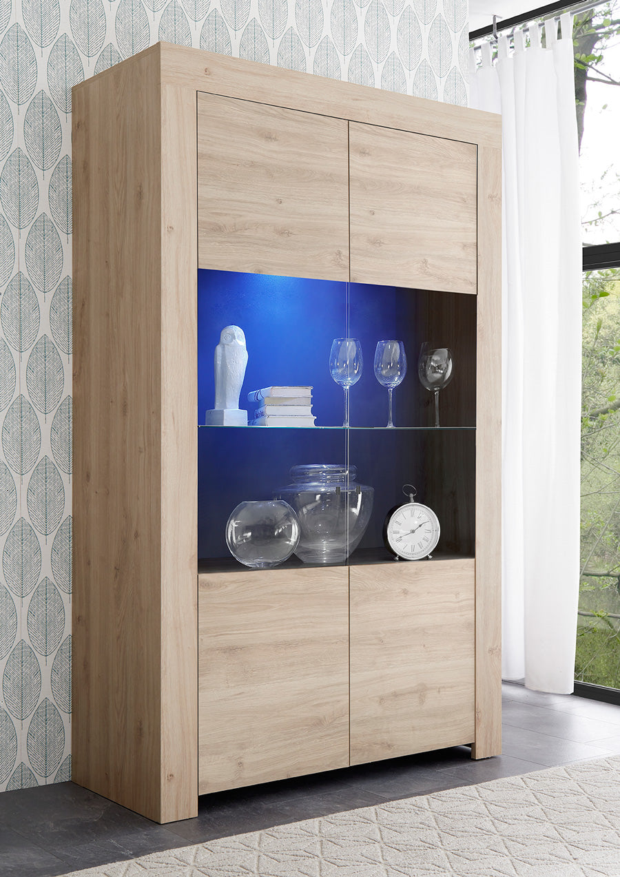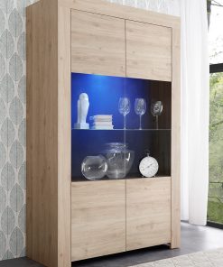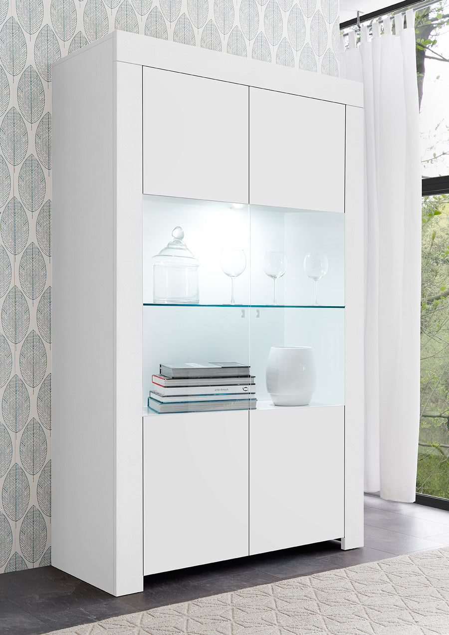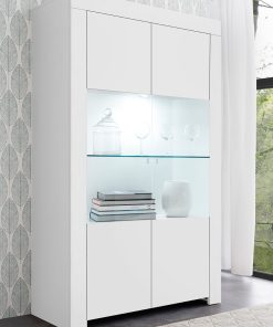 Graziosa vetrina alta con 2 ante con ripiano centrale in vetro, prodotta in legno in due varianti: bianco opaco o rovere cadiz. La vetrina moderna Ludmilla è tra le più richieste proprio per la sobrietà e semplicità del design, con la sicurezza di una struttura robusta e solida, risultato della lavorazione Made in Italy. Per chi lo desidera, inoltre, potrà aggiungere una luce che illumina la vetrina internamente, scegliendo tra una luce bianca, blu o multicolor.