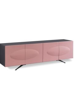 Madia da cm 201 con 4 ante prodotta in legno, con struttura in melaminico grigio scuro e frontali disponibile in 3 colori diversi: rosa antico, verde petrolio o grigio. Distinta dalla decorazione con ovali realizzati in rilievo e che realizzano un mobile originale.