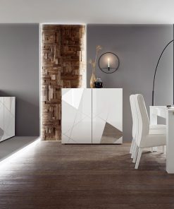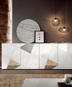 Meraviglioso soggiorno completo Madison comprendente un tavolo allungabile da cm 137 con prolunga laterale, madia 4 ante e credenza 2 ante. L’eleganza dei mobili living Madison è la caratteristica che spicca, scegliendo una versione puramente geometrica e contemporanea del design. Infatti, specchi decorativi sagomati sul frontale dei mobili, seguono una composizione di triangoli serigrafata ottenendo un risultato visivo dinamico e originale.