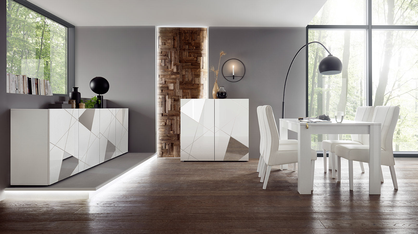 Sala da pranzo moderna con tavolo allungabile madia e credenza bianco lucido con specchi