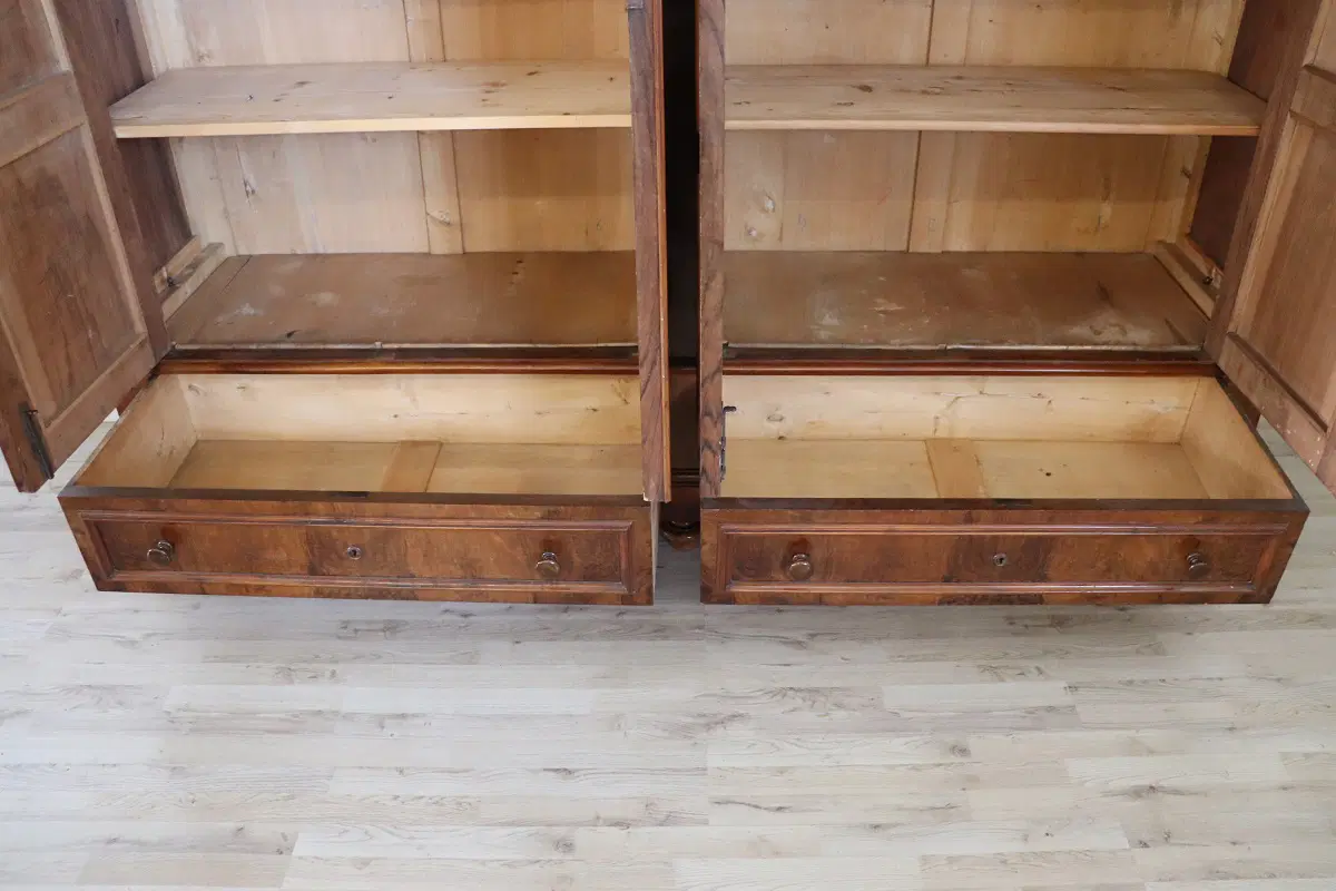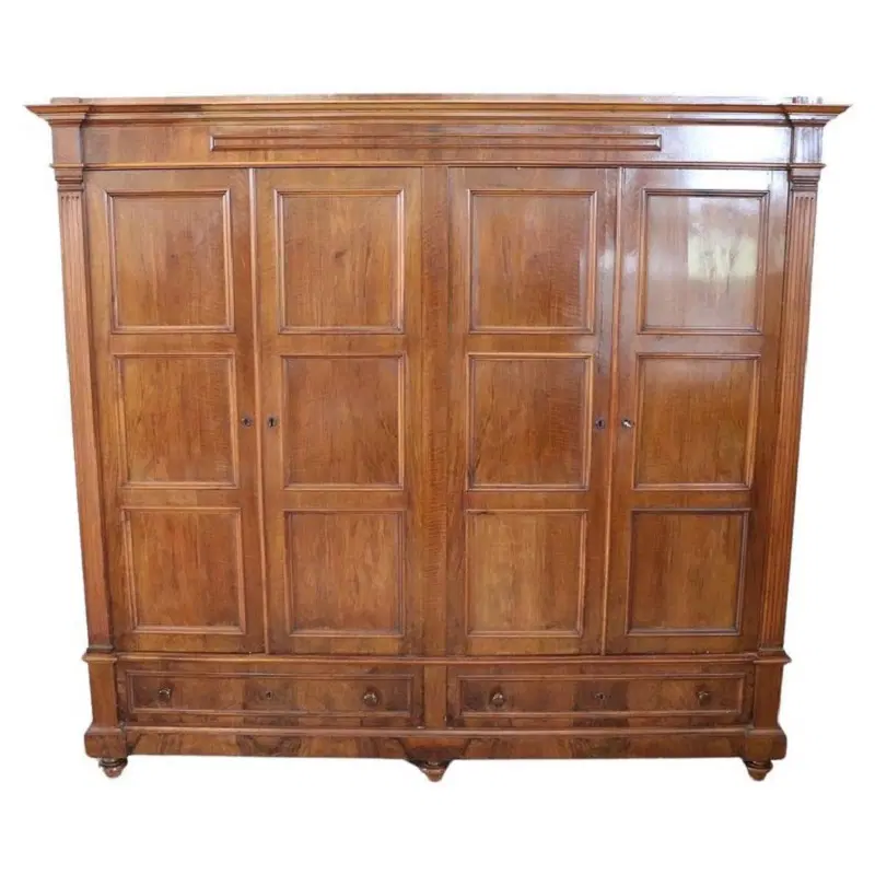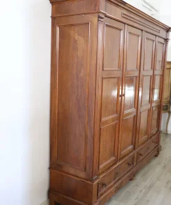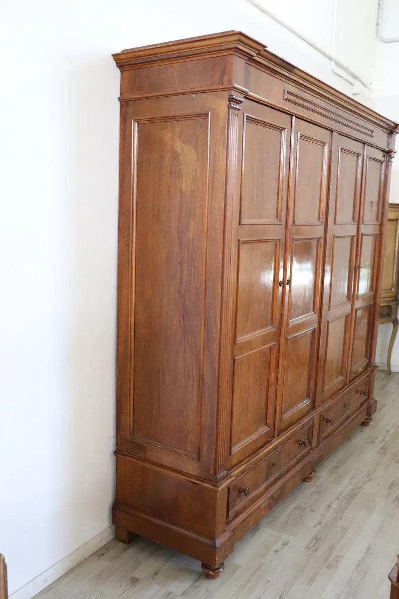 Armadio antico quattro ante seconda metà XIX secolo. Armadio antico in legno di noce massello realizzato nella seconda metà del XIX secolo in Italia. Questo armadio davvero spettacolare è molto raro per le sue grandi dimensioni dotato di quattro ante. Molto semplice e lineare. L’interno è diviso in due parti e in entrambe le parti sono presenti tre solidi ripiani. Possibile modificare l’interno in base alle vostre esigenze. Nella parte bassa due pratici cassetti. Attenzione questo armadio verrà spedito completamente smontato, il montaggio non è incluso nella consegna. Proposto ad un’ottimo prezzo trattabile vi invitiamo ad inviarci le vostre proposte di acquisto le valuteremo con piacere. Vi consigliamo comunque di guardare bene in dettaglio tutte le foto allegate.