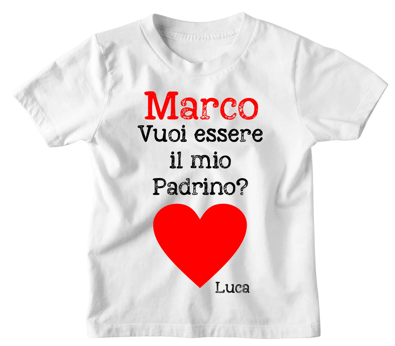 Maglietta Bambino Divertente Cuore Gigante Vuoi essere il mio padrino? – personalizza con il Nome della Padrino e del Bimbo/a – Idea Regalo