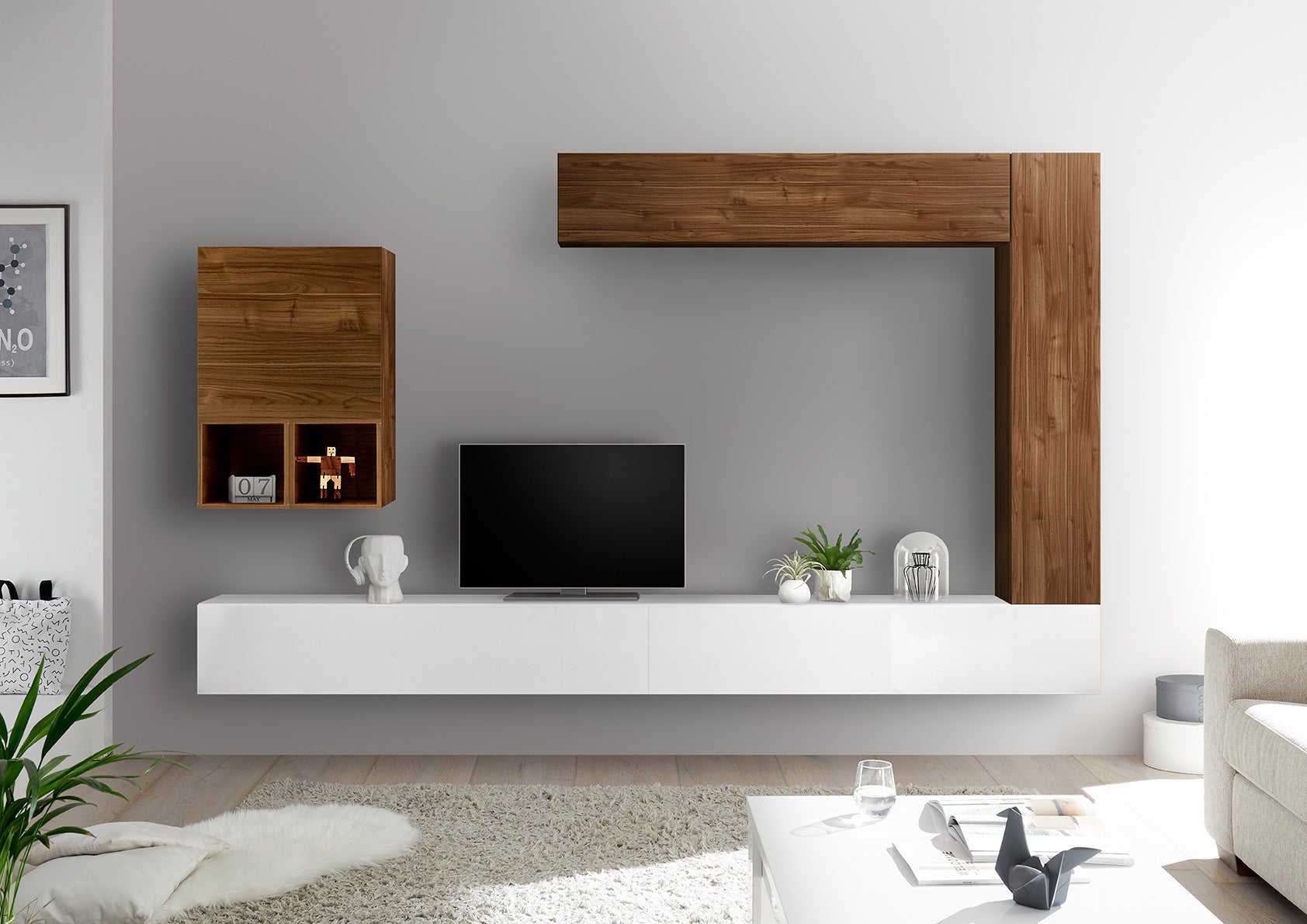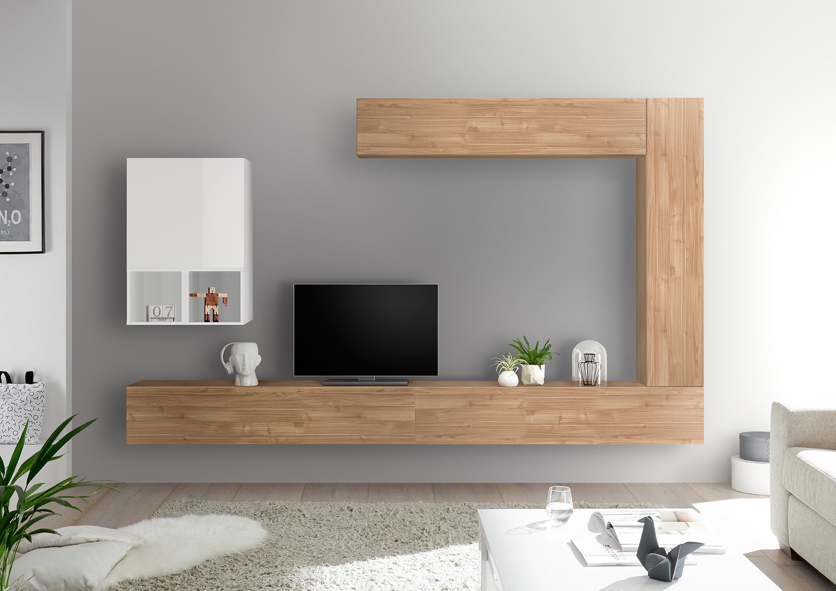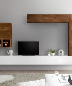 Parete moderna Maia, un modello componibile e per questo altamente versatile, costituita da tutti elementi sospesi, dal design essenziale.