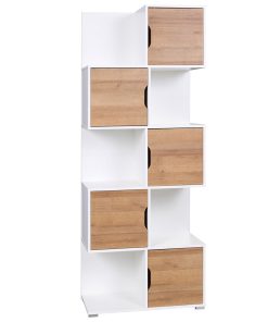 Mobile libreria composta da 5 vani a giorni e 5 ante, disposte in maniera alternata che regala un aspetto dinamico e uno stile unico e stiloso. Realizzata in legno con struttura bianco opaco, le 5 ante sono contrastate dalla finitura naturale del legno.
