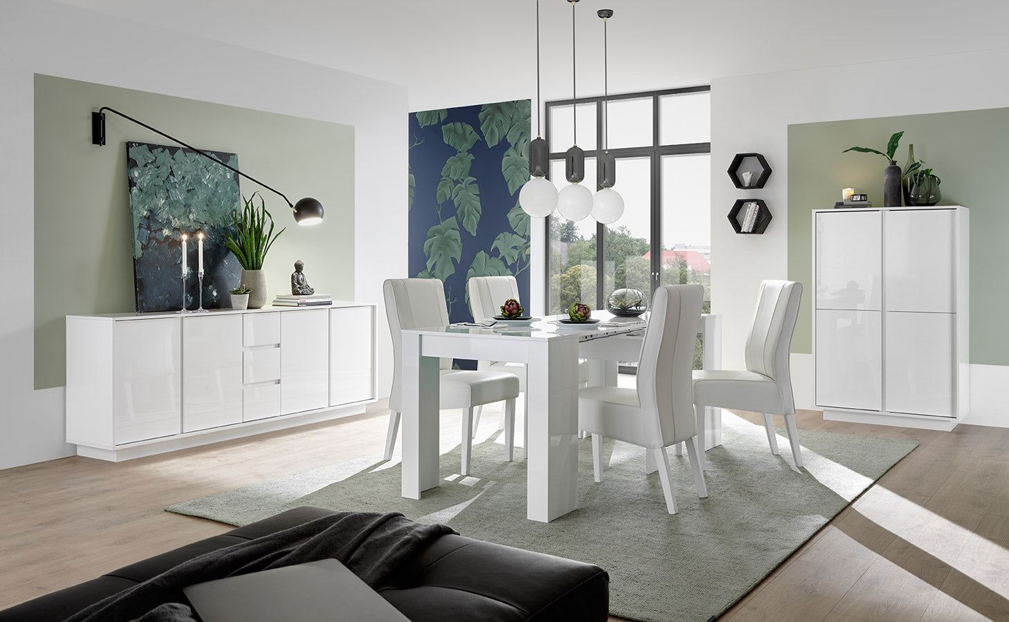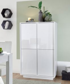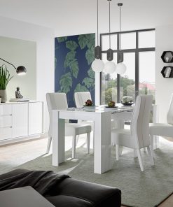 Soggiorno moderno completo Maniago, comprendente un tavolo allungabile da cm 137 con allunga da cm 48, ampia madia con ante e cassetti e credenza alta 4 ante. La bellezza di questa sala da pranza è proprio l’assoluta linearità delle forme dei mobili che la compongono con pannelli in legno bianco laccato lucido.