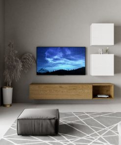 Margò – Parete zona giorno con pensile e cubi in legno bianco e quercia