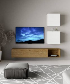 Margò – Parete zona giorno con pensile e cubi in legno bianco e quercia