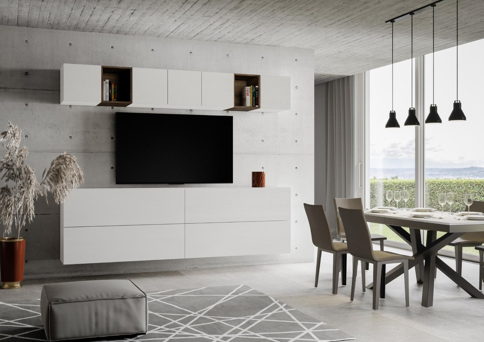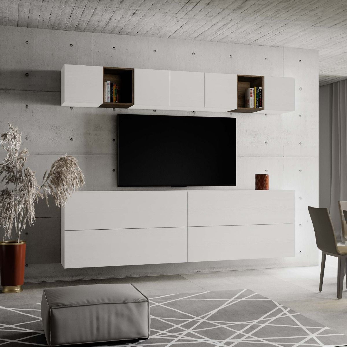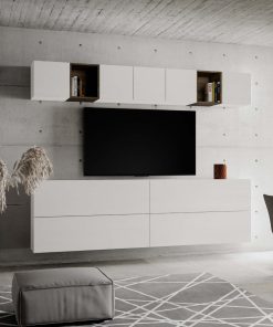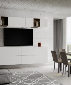 Parete per living Mariposa, un’altra soluzione funzionale per attrezzare la tua zona giorno della capienza necessaria. La parete attrezzata Mariposa, comprende 4 pensili orizzontali da cm 134 con 5 cubi e 2 vani a giorno, elementi che si prestano in modo pratico, a creare la tua parete ideale componendola come vuoi.
