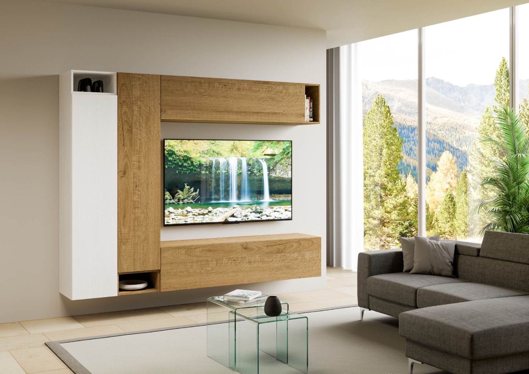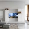 Bellissima parete moderna per il soggiorno o o salotto composta da 4 pensili lunghi e 3 vani a giorno. Distinta da un design essenziale e ricercato, la parete living Marisa è realizzata in legno bianco frassino e quercia.