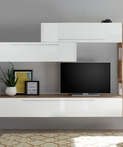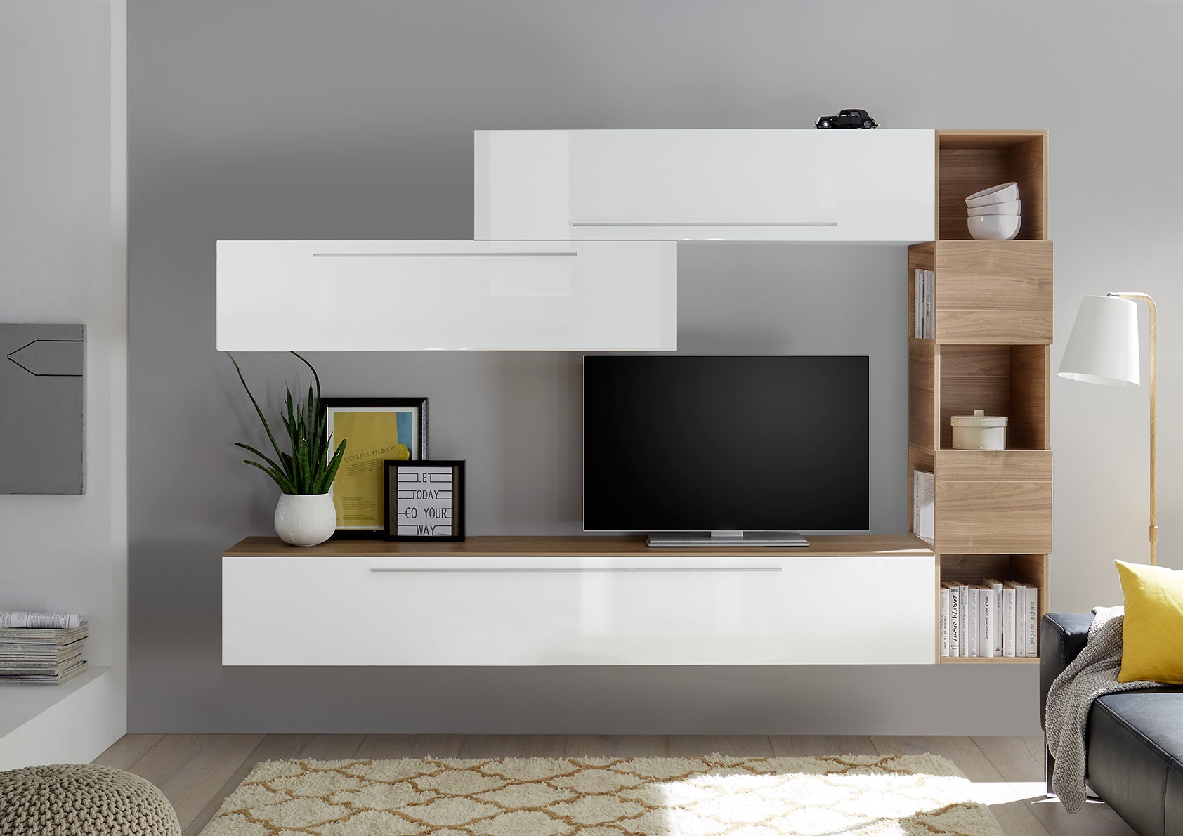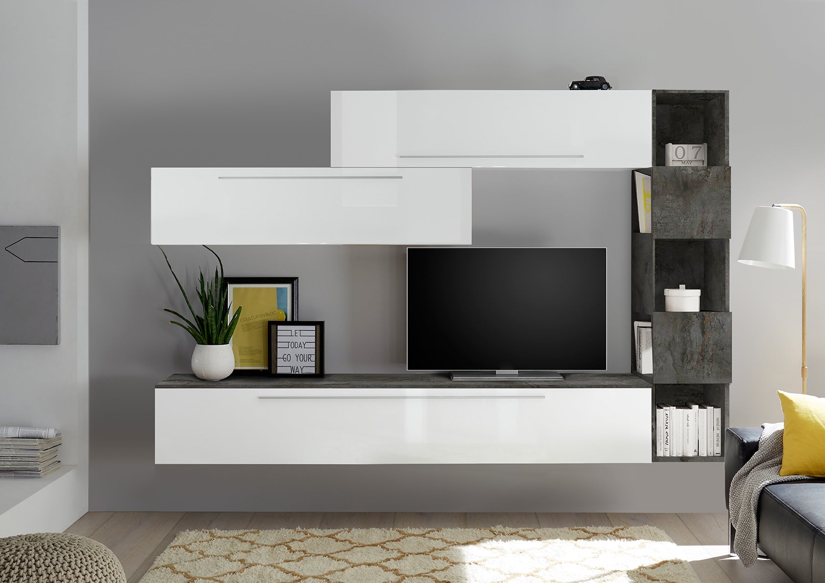 Parete attrezzata componibile Mason, pensata per ottimizzare al massimo gli spazi del vostro soggiorno, senza rinunciare alla capienza. Infatti, la parete moderna Mason mette insieme vari pensili orizzontali sospesi e una libreria, anch’essa sospesa, e che caratterizza la parete grazie ad un accattivante design a scacchiera.
