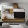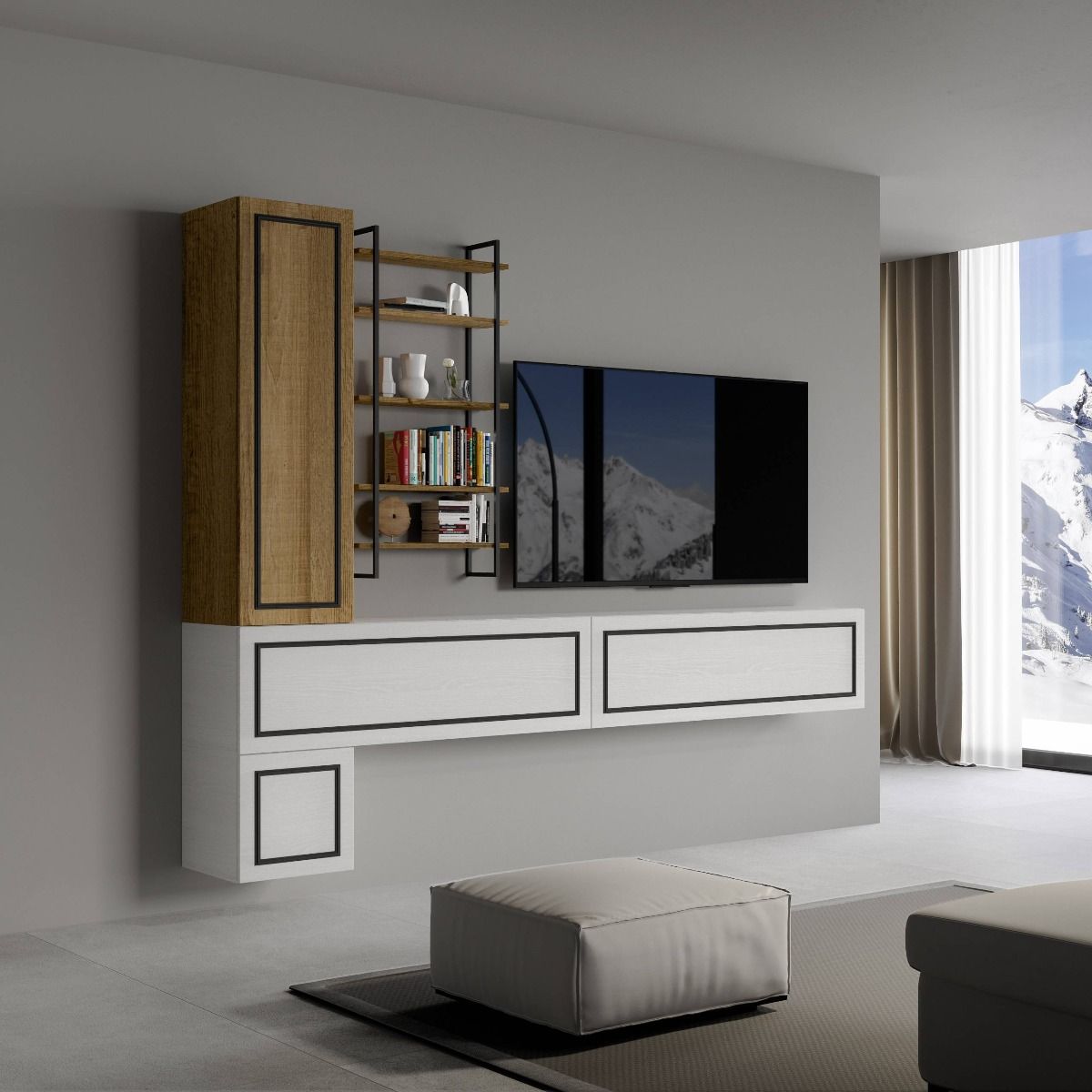 Parete attrezzata moderna Melita Evo composta da pensili in legno sospesi bianco frassino e quercia, caratterizzati da una cornice in legno colore antracite, che aggiunge un dettaglio innovativo. Potrai accompagnare una libreria come optional, realizzata in ferro con 5 mensole in legno colore quercia per arricchire la tua parete componibile.
