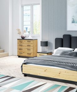 Affascinante camera matrimoniale completa Mendola, un’idea all’avanguardia dedicata a chi vuole distinguersi. Infatti, il particolarissimo letto contenitore con la sua stupenda testiera sagomata, detta le caratteristiche di uno stile originale, dotata di imbottitura e rivestita in similpelle colore nero. Mendola si compone anche di armadio 2 ante, cassettiera e 2 comodini realizzati in legno finitura naturale contrastata da parti in nero opaco, tutti elementi che realizzano uno stile industriale moderno e innovativo.