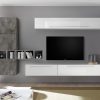 Parete attrezzata Meneo, completamente sospesa e componibile, formata da vetrina, due pensili orizzontali e un pensile libreria. Fruibile in diverse varianti.