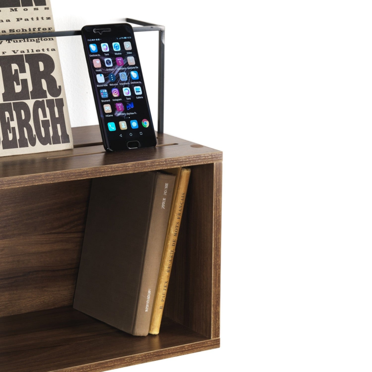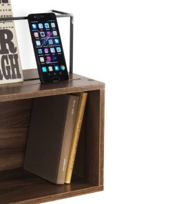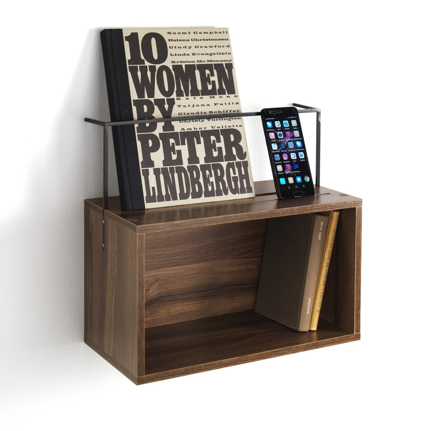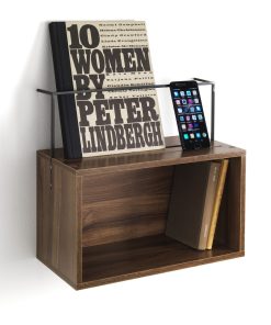 Mensola da parete realizzata in legno e metallo seguendo uno stile moderno di fabbricazione. La mensola si presenta in legno con finitura noce e dispone di un vano contenitore su cui posizionare decorazioni come libri e altra oggettistica, due vani sulla superficie superiore che consentono di appoggiare documenti e cellulari ed una struttura in metallo che offre il sostegno per gli elementi posti nei due vani disponibili. La mensola si adatta facilmente ad ogni ambiente mantenendo invariate le sue caratteristiche e le sue doti.