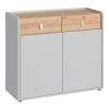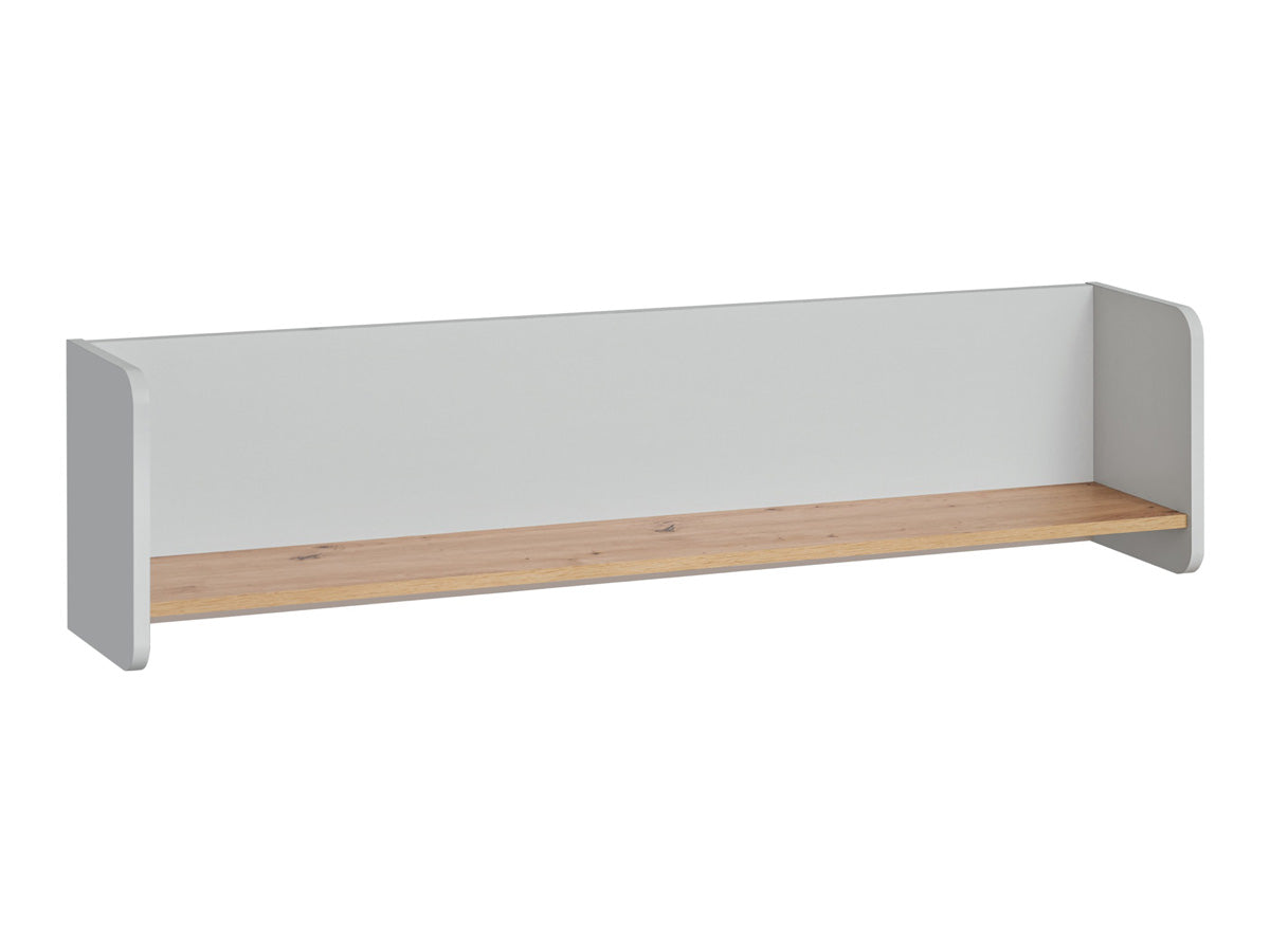 Mensola da parete con schienale, prodotta in legno con colori contrastanti grigio chiaro e naturale.