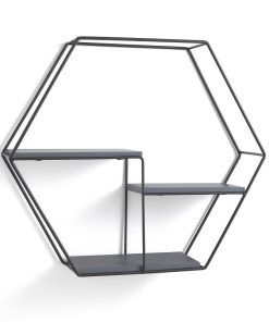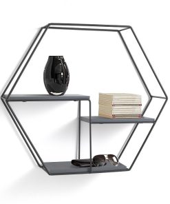 Delicata mensola da parete moderna a 3 ripiani con struttura in metallo e ripiani in legno. La composizione si presenta con una colorazione nera tipica degli elementi più moderni ed assume una forma geometrica che aiuta e rende facile l’installazione sul muro e mette in risalto lo stile moderno di questa mensola. Con decorazioni come foto e vasi e piante si riesce a creare un ambiente luminoso e vivo.