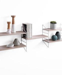 Mensola da parete a 3 scomparti con un totale di 5 ripiani in legno finitura rovere, mentre la struttura è realizzata in metallo bianco.