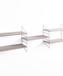 Mensola da parete a 3 scomparti con un totale di 5 ripiani in legno finitura rovere, mentre la struttura è realizzata in metallo bianco.