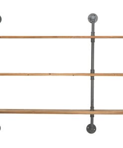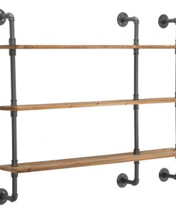 Scaffale pensile con 3 ripiani, un complemento dal particolare design industrial, composto da struttura in ferro formata da tubi idraulici e 3 ripiani in legno di abete.