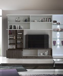 Fantastica parete attrezzata modello Mercury, un modello compatto che occupa l’intera parete per ottimizzare al massimo gli spazi, creando un’unica struttura ricca di vani interni ed esterni. Mercury comprende una vetrina, pensili con vani interni e base TV con ante a ribalta e cassetto, il tutto arricchito da una graziosa libreria.