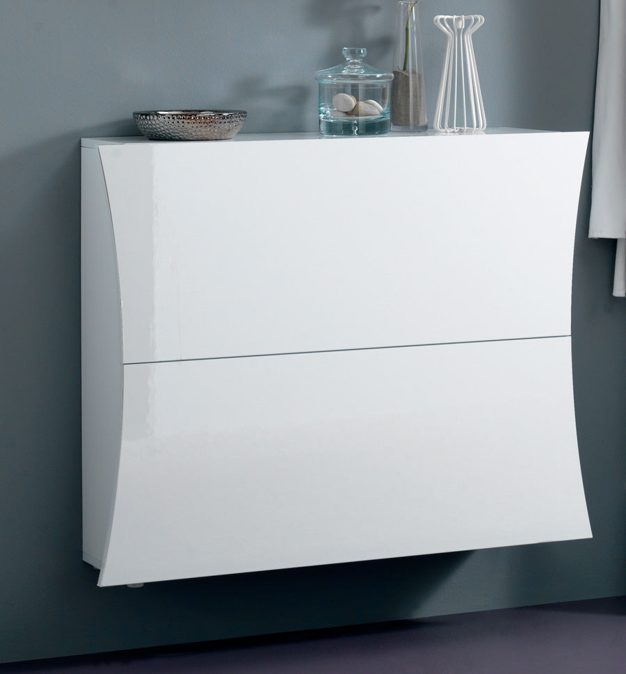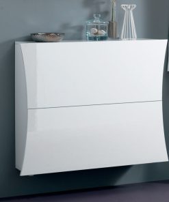 Scarpiera sospesa, in legno, colore bianco lucido. Il mobile dispone di 2 ante a ribalta, abbastanza capienti per riporre le vostre scarpe in ordine. Dal design arcuato, questa scarpiera è il giusto complemento per chi desidera un arredamento diverso dal solito, moderno e originale.