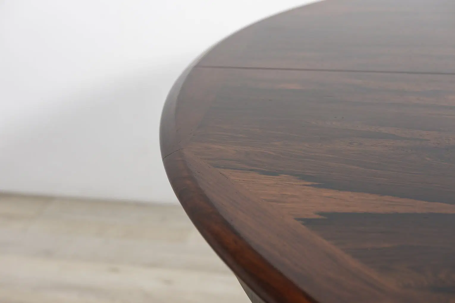 Round rosewood table. The furniture has interesting graining and reinforced edges. Made in Denmark in the 1960s. The table after a comprehensive carpentry renovation, cleaned of the old surface, painted with rosewood stain, finished with a colorless varnish. The table can be unfolded through two extra beds from 115 cm to 223 cm