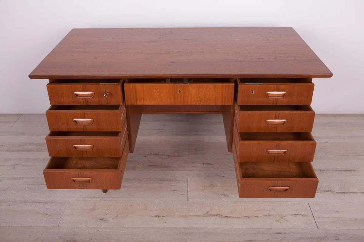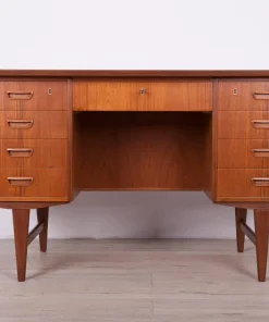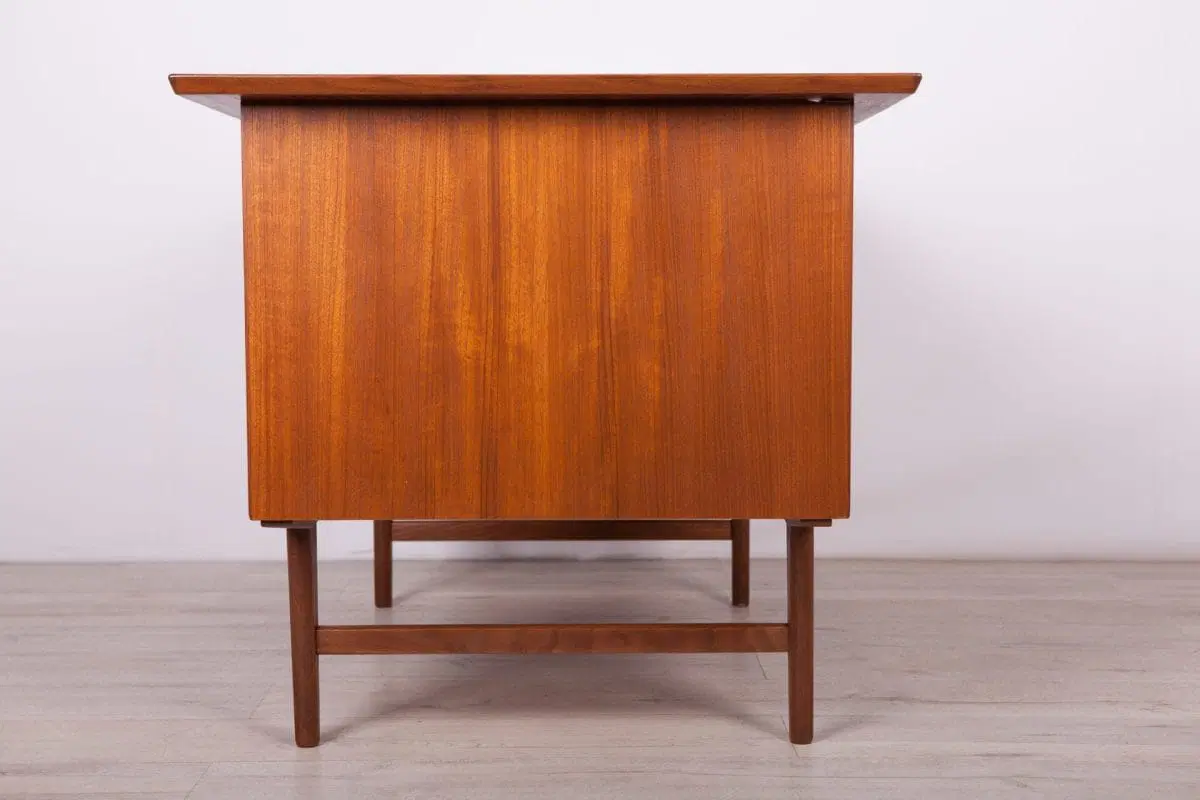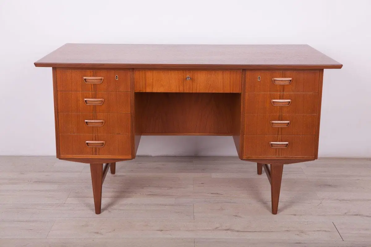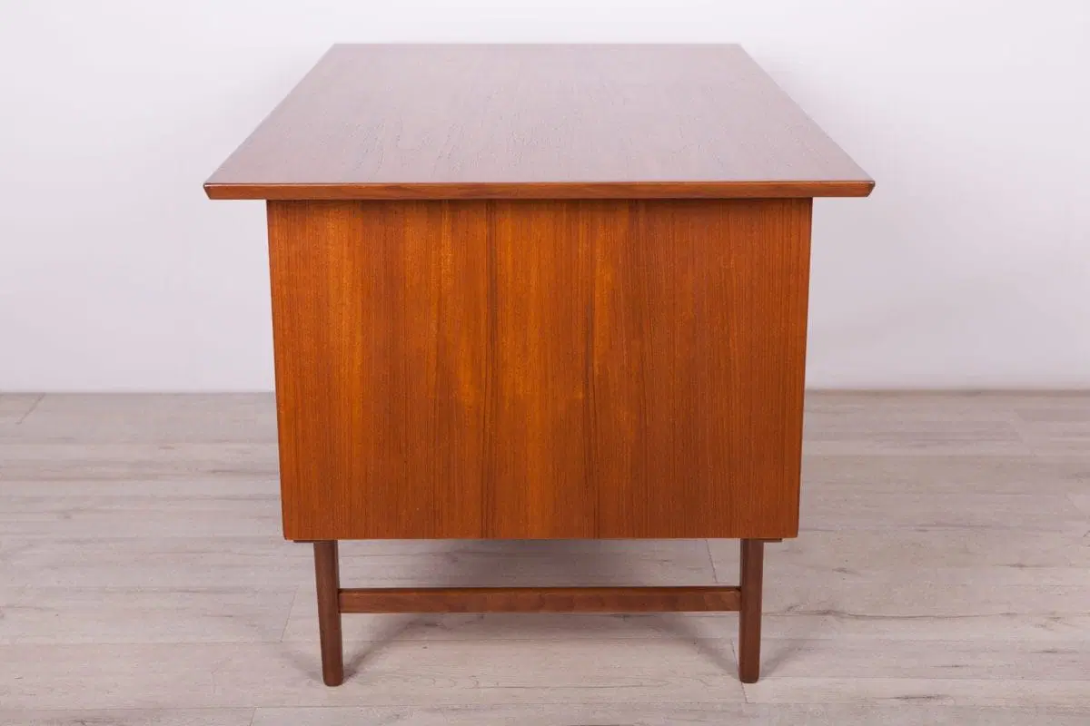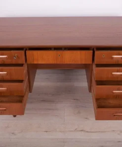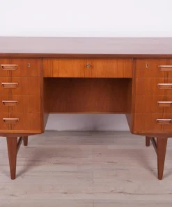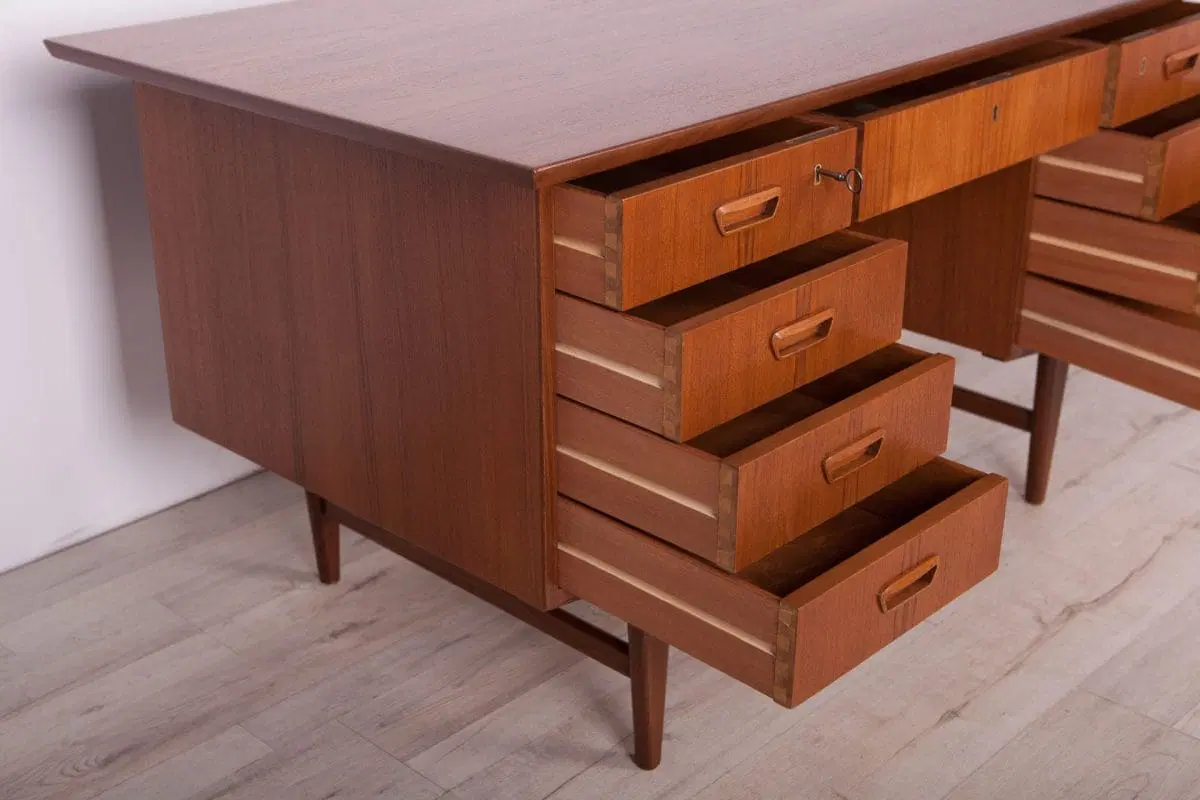 This desk was made in Denmark in the 1960s. The desk is made of teak wood and is free-standing thanks to the finished back with an open storage space (bookcase). It was made of teak wood with contoured handles. It consists of nine drawers, four drawers in two modules and a middle drawer. The teak elements have been cleaned and painted in an oak stain and polished with a semi-gloss lacquer.