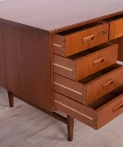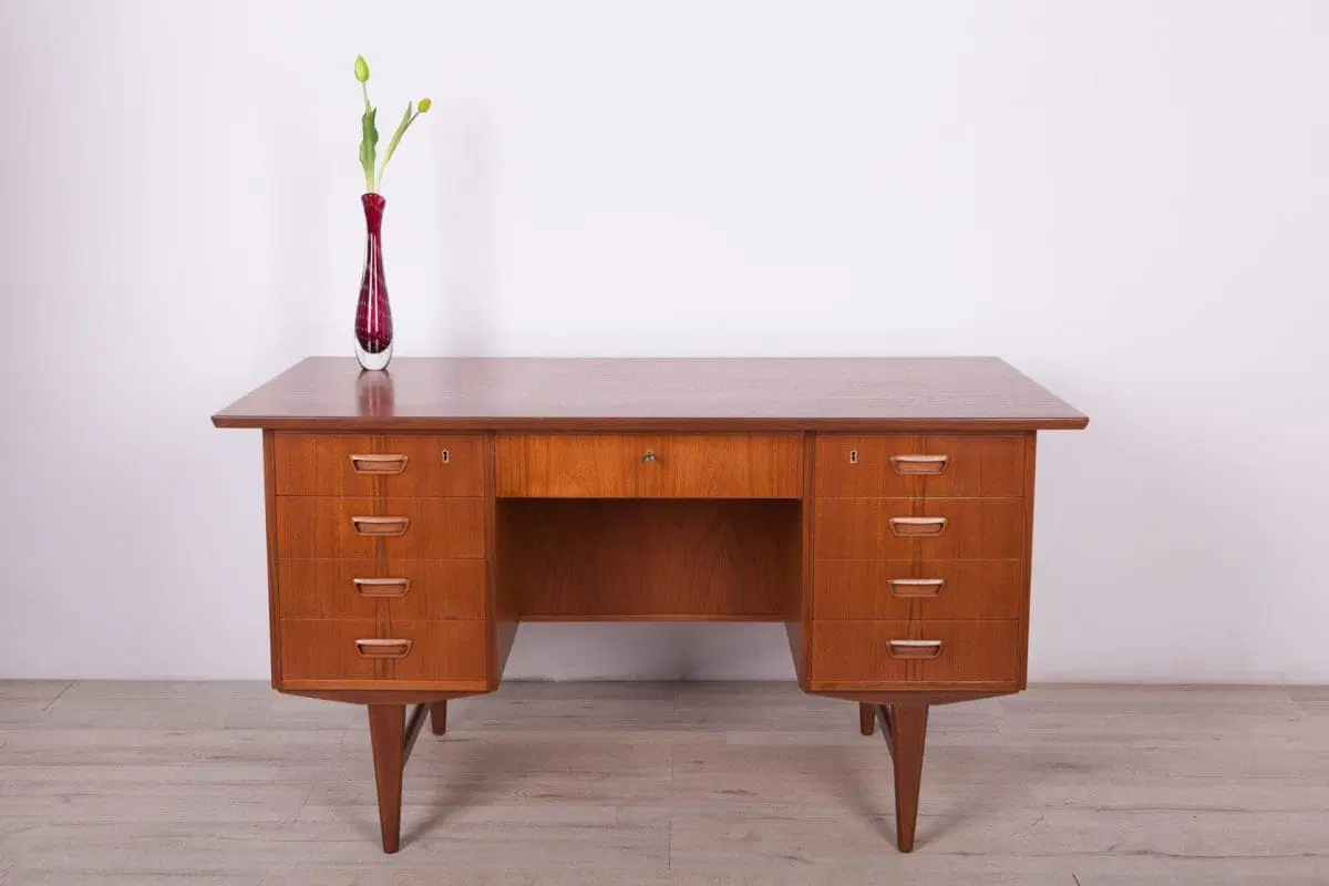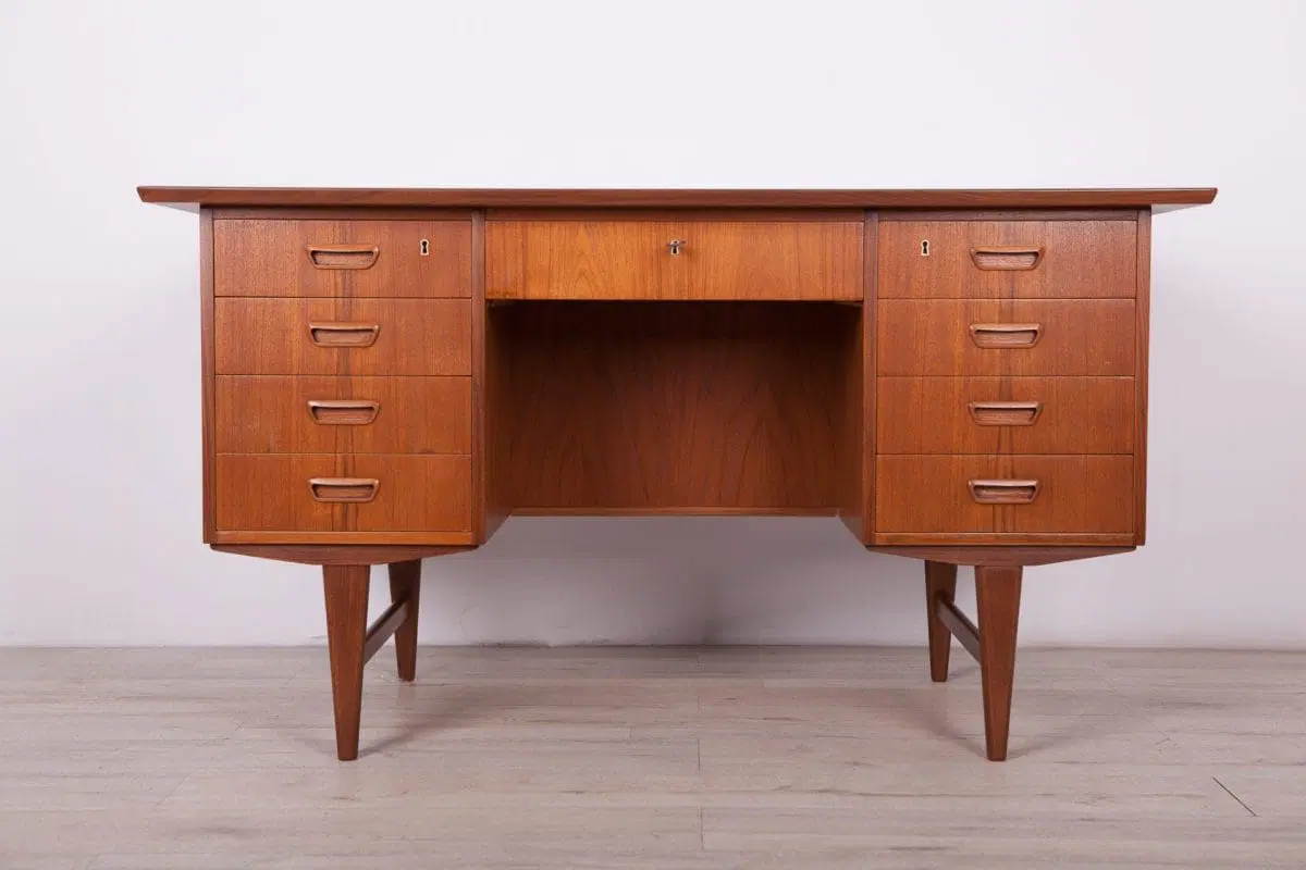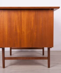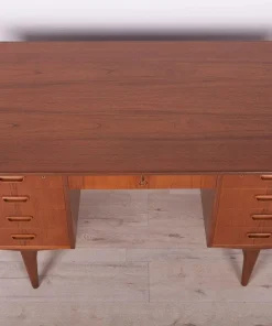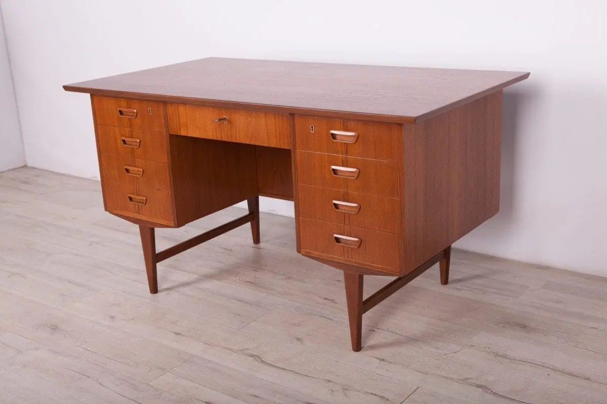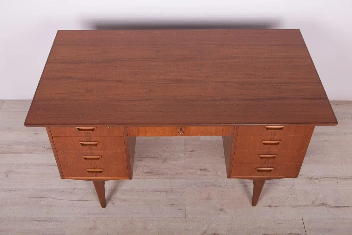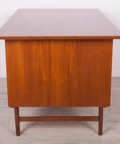 This desk was made in Denmark in the 1960s. The desk is made of teak wood and is free-standing thanks to the finished back with an open storage space (bookcase). It was made of teak wood with contoured handles. It consists of nine drawers, four drawers in two modules and a middle drawer. The teak elements have been cleaned and painted in an oak stain and polished with a semi-gloss lacquer.