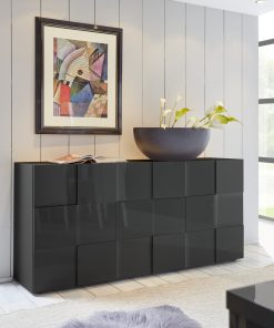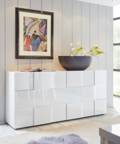 Bellissima madia design con 3 ante, un modello destinato ad un ambiente contemporaneo, giovanile e dinamico. Infatti, questa madia moderna Mindy, sfoggia le sue particolari ante caratterizzate dall’alternanza di elementi quadrati in rilievo che creano un gioco interessante, ancora più caratteristico grazie alla superfice lucida a specchio.