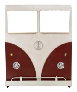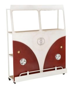 Questo mobile bar richiama un vecchio bus, dotato di 3 comodi ripiani e completo di alloggi portabottiglie e porta bicchieri.