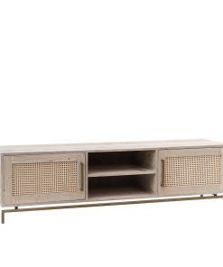 Mobile porta tv in legno massello naturale con vani e ante con paglia