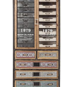 Mobile con 2 ante in vetro e fornito di tanti cassetti, ideato per creare ambienti in stile industriale e dall’accento fortemente creativo. Un mostro mobile da soggiorno è realizzato con struttura in legno di pino e 5 cassetti nella parte inferiore vivacemente decorati, mentre nella parte superiore due ante vetrate chiudo vani con altri piccoli cassetti.