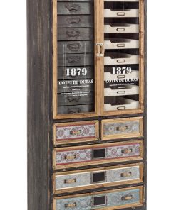 Mobile con 2 ante in vetro e fornito di tanti cassetti, ideato per creare ambienti in stile industriale e dall’accento fortemente creativo. Un mostro mobile da soggiorno è realizzato con struttura in legno di pino e 5 cassetti nella parte inferiore vivacemente decorati, mentre nella parte superiore due ante vetrate chiudo vani con altri piccoli cassetti.