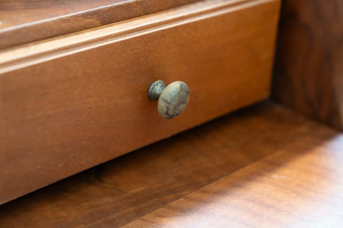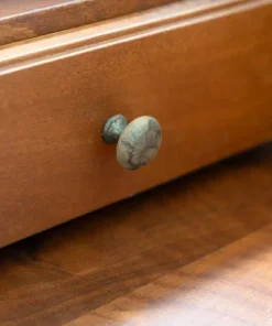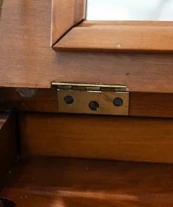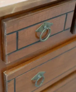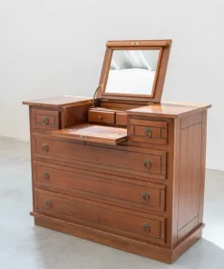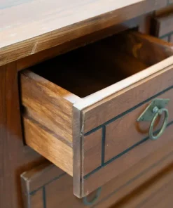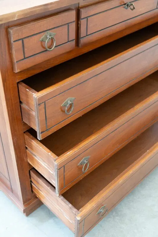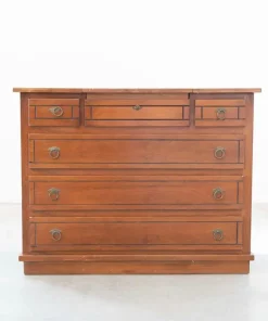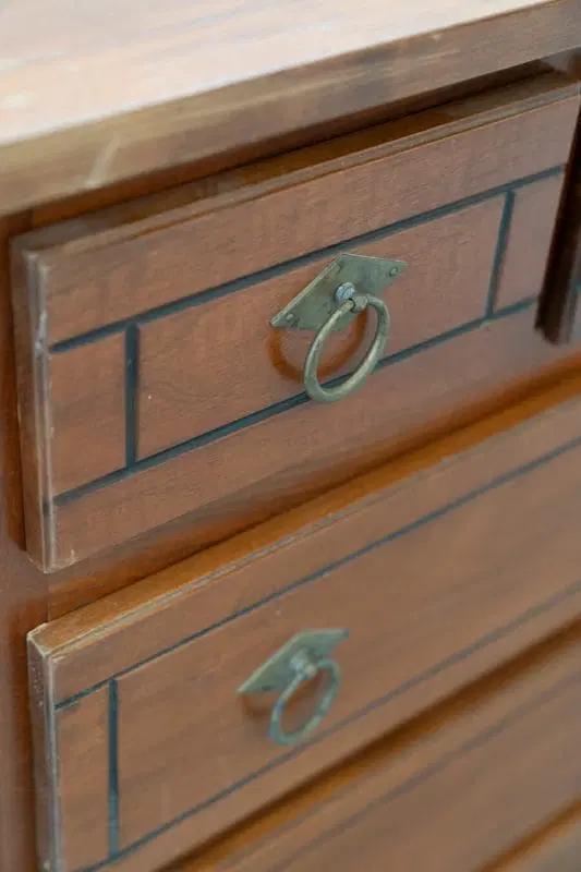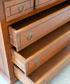 DESCRIZIONE in legno di ciliegio con cassetti di coda di rondine, intarsiato e maniglie in ottone