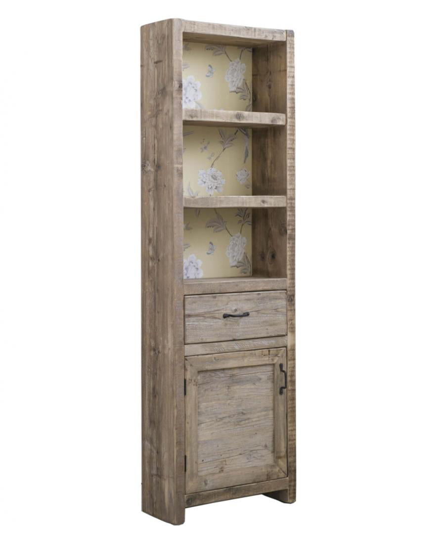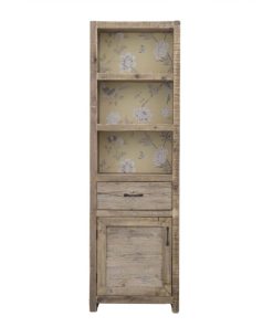 Credenza scaffale alta e stretta, strutturata con cassetto, anta e ripiani, un mobile frutto del design e della lavorazione italiana, attenta a produrre prodotti originali, esclusivi e di buona qualità. Questa credenza impiega legno di recupero per formare una struttura robusta con spessi pannelli, resa unica per la decorazione floreale che riempie lo schienale.