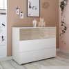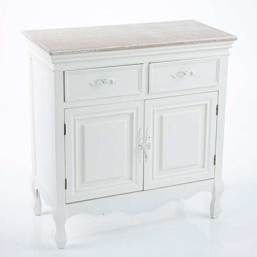 Raffinato mobile credenza in legno di pino, colore bianco. La struttura, sostenuta da 4 gambe a sciabola, è dotata di 2 cassetti e 2 ante, con maniglie particolarmente decorate. Il piano di appoggio, invece, ha una colorazione legno naturale, ideale per poggiarvi sopra foto ricordo, piantine o altri oggetti di vostro uso quotidiano. Semplice ma elegante, la credenza donerà al vostro soggiorno o sala da pranzo un look innovativo, dando luce al vostro ambiente.